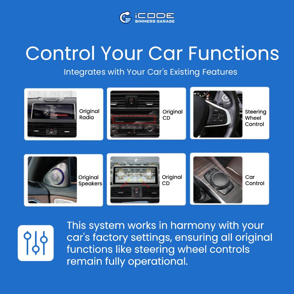 • Keep all your OEM car Menu, Maps, and Features, like parking distance sensors, reverse camera, sports display, service history, and 360 cameras.